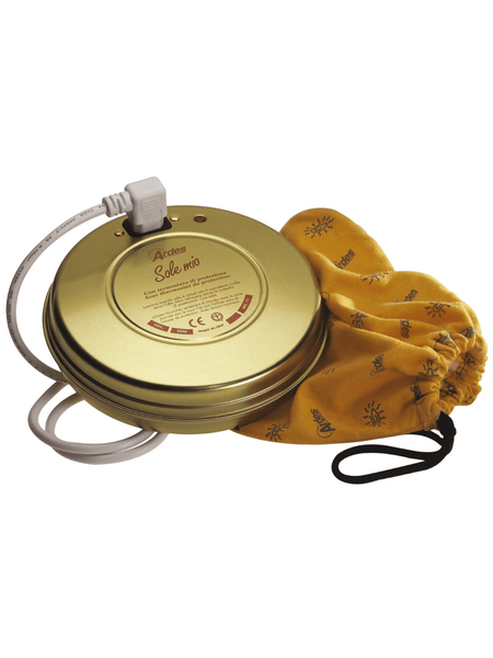 Scaldino ad accumulo di calore con termostato di sicurezza, lampada spia e pratica custodia. Scaldino è 19 cm., potenza 550 Watt, involucro in lamiera stagnata, carica termica 3 min., mantenimento del calore 3 ore.